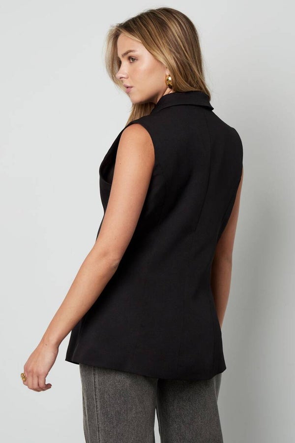 Deze mouwloze blazer is een echte musthave voor je garderobe. De klassieke revers, het mooie getailleerde model en de opvallende goudkleurige bloemknoop maken dit item super stijlvol. Doordat de blazer mouwloos is, draag je hem zowel chic als casual en is hij perfect voor elk seizoen. Verkrijgbaar in klassiek zwart en trendy lila, zodat je hem altijd kunt combineren met jouw favoriete outfits. Draag hem op een jeans, rok of pantalon en steel gegarandeerd de show.