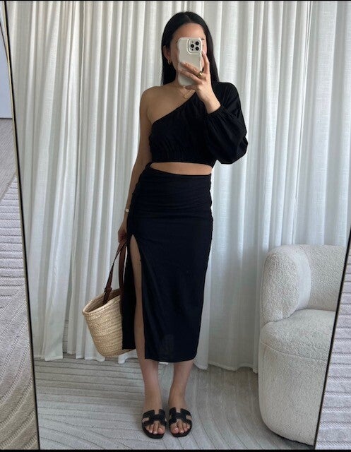 Ben jij ook fan van outfits die nét even anders zijn? Deze zwarte one-shoulder top met lange mouw en elastische band is super vrouwelijk én stoer tegelijk. Combineer ’m met de aansluitende zwarte rok met split voor een stijlvolle en toch comfortabele look!