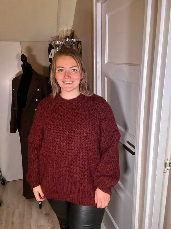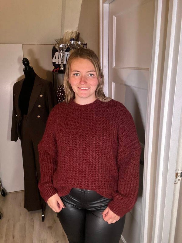 Wat een heerlijke trui voor de koudere dagen! Deze prachtige wijnrode trui heeft een grofgebreide structuur en een comfortabele pasvorm. De stof voelt zacht aan en houdt je lekker warm zonder te prikken.