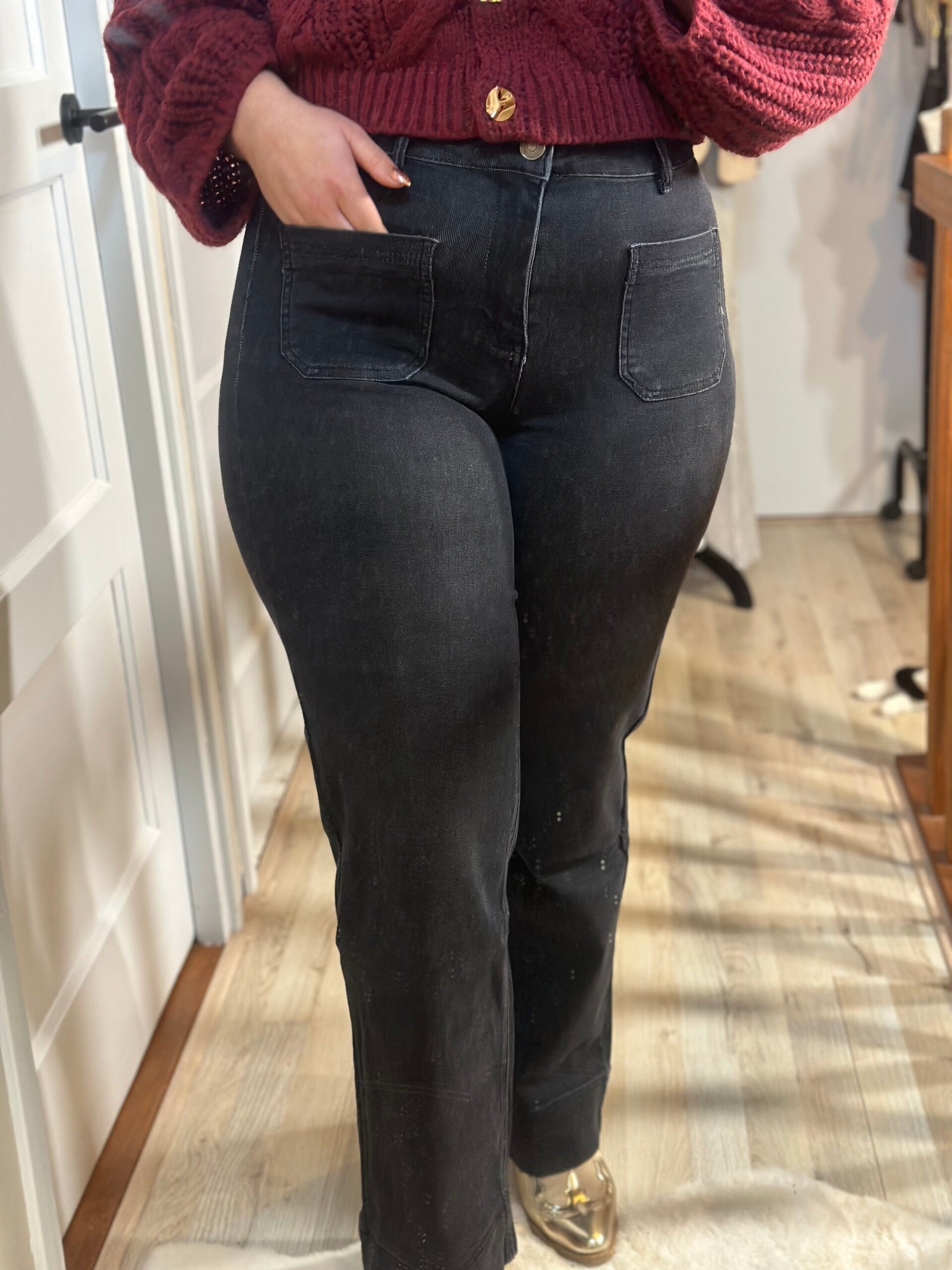 Deze zwarte wide leg jeans is zo’n broek waar je elke keer weer naar grijpt. Een hoge taille, lekkere stretch en een pijp die mooi recht langs je been valt. Staat geweldig met sneakers, laars of hak 😊