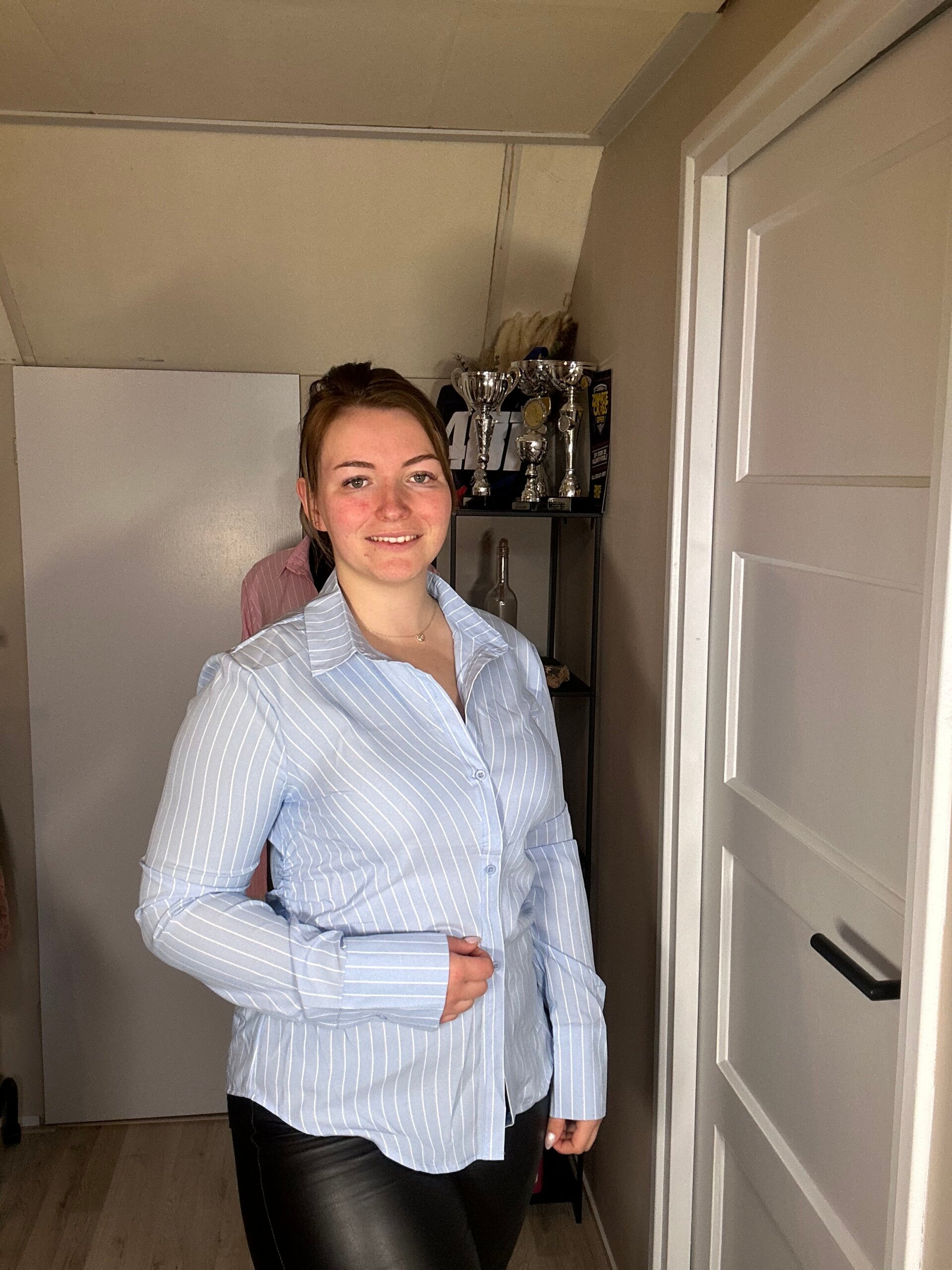Deze zachte blauwe kleur met fijne witte strepen doet iets met je. Alsof je meteen iets lichter gaat lopen. De stof voelt soepel en draagt heerlijk. Geen gedoe, geen kriebel, maar gewoon een fijne pasvorm die met je meebeweegt.