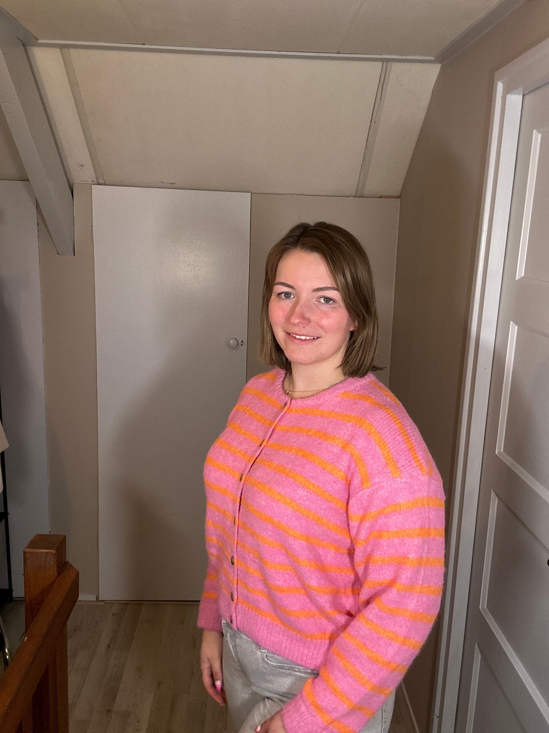 Roze Vest met Oranje Strepen – Zachte Knit – One Size (t/m L)